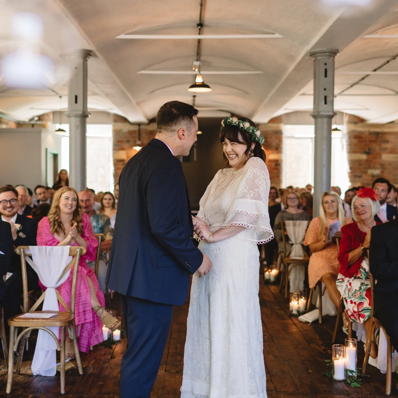 Ceremonies can take part is a completely separate room in the mill, ‘The Spinning room’. It’s a charming little room with a perfect mix of large glass windows, exposed red brick and industrial wooden floors.